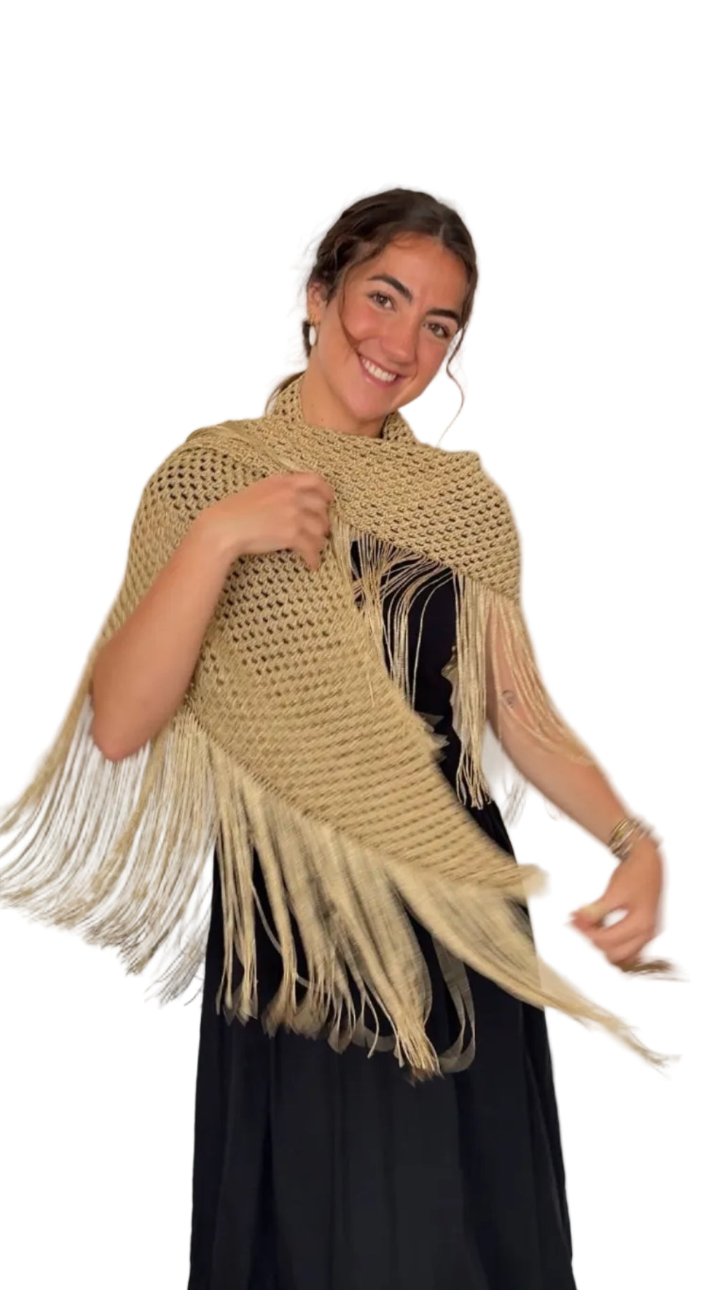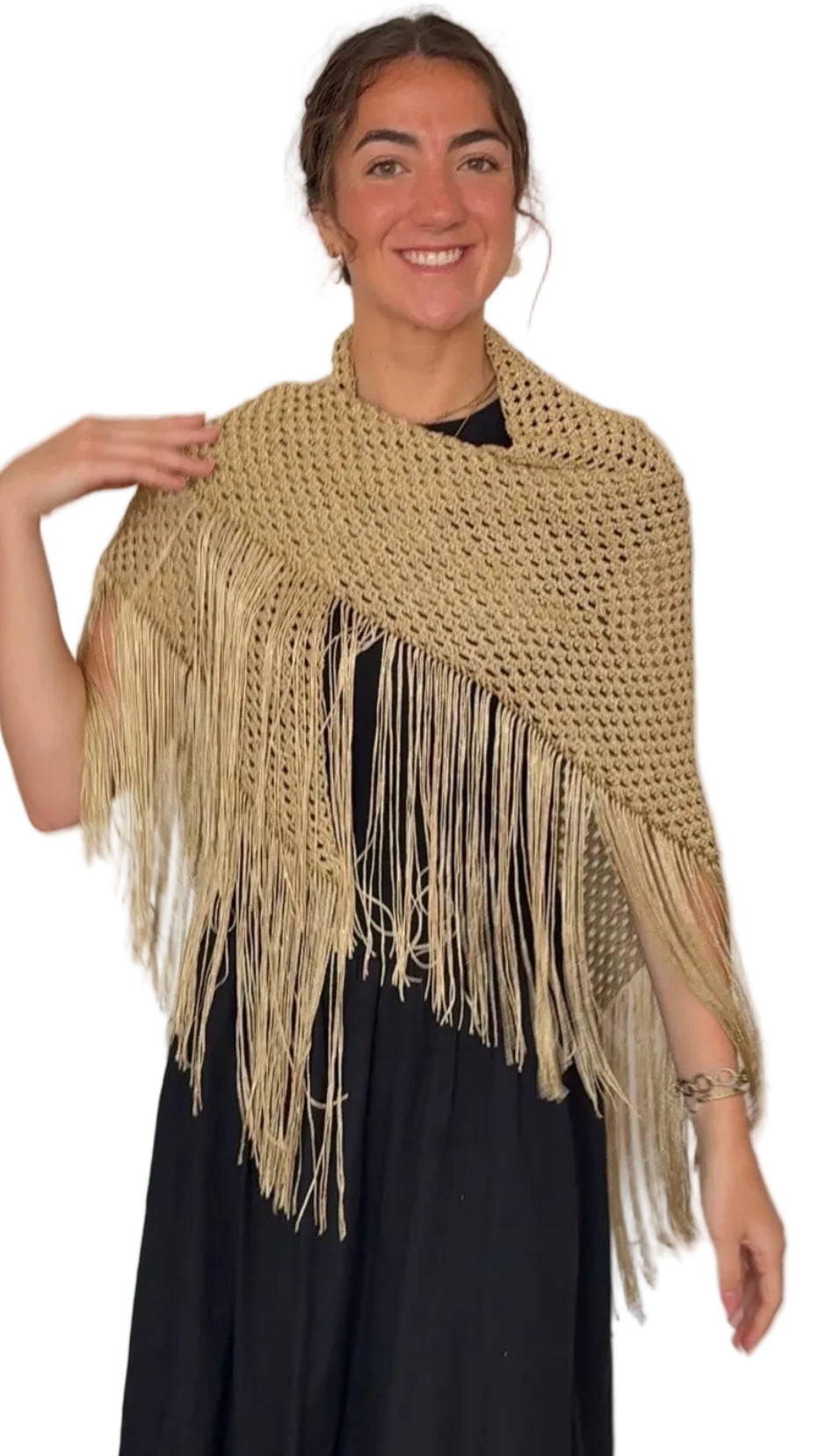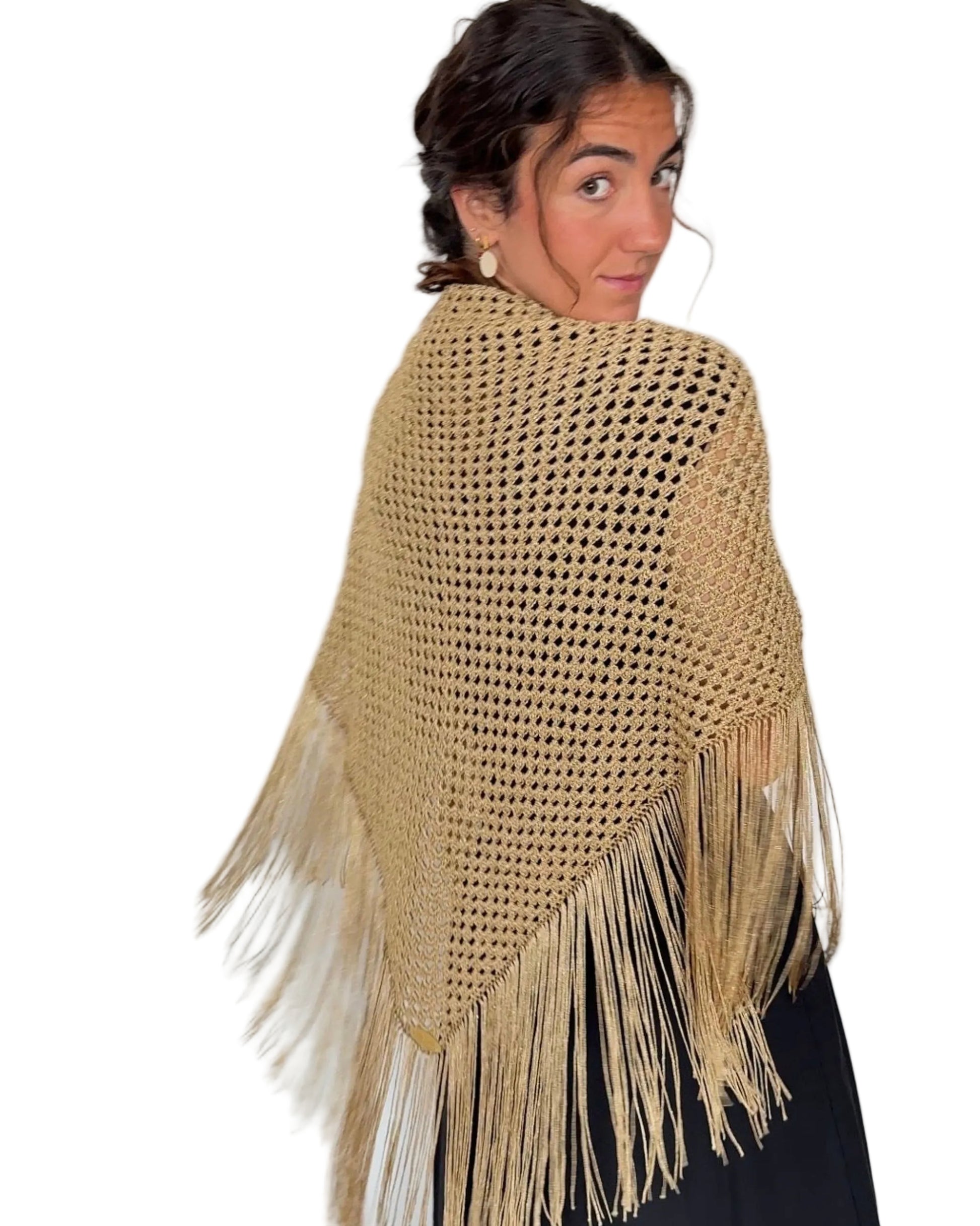Aurora es un chal tejido a mano en hilo lamé metalizado que aporta luz, movimiento y un acabado delicado a cualquier look de invitada.