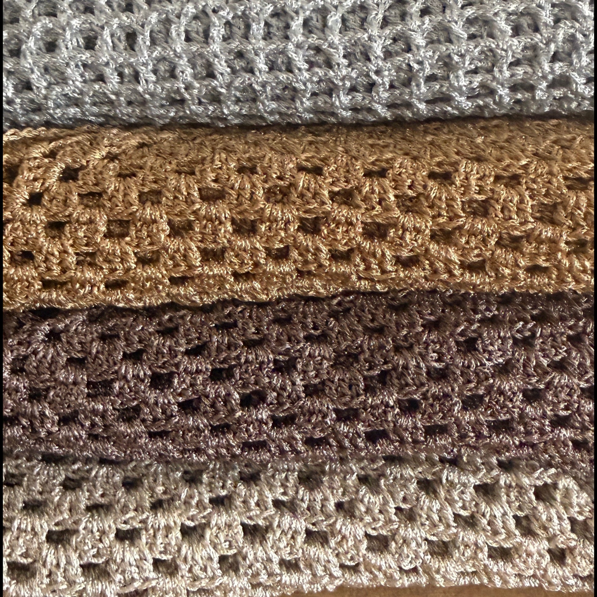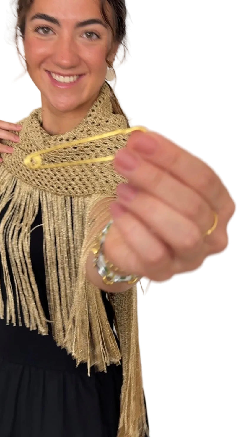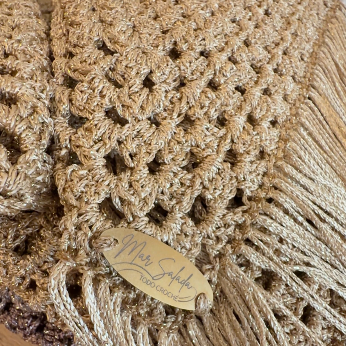 Aurora es un chal tejido a mano en hilo lamé metalizado que aporta luz, movimiento y un acabado delicado a cualquier look de invitada.