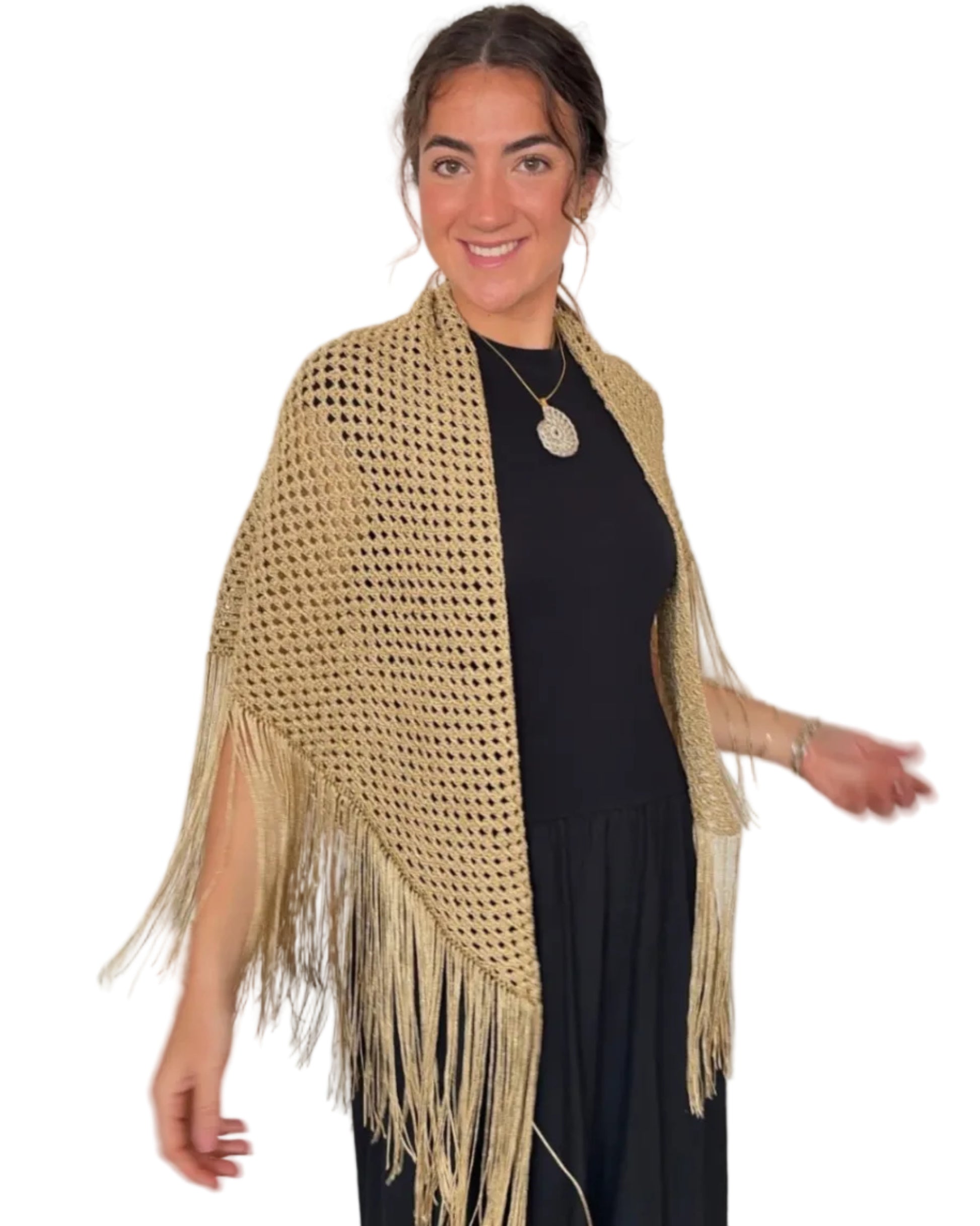 - Medidas: 130 cm de punta a punta y 70 cm en el centro al pico (sin flecos)