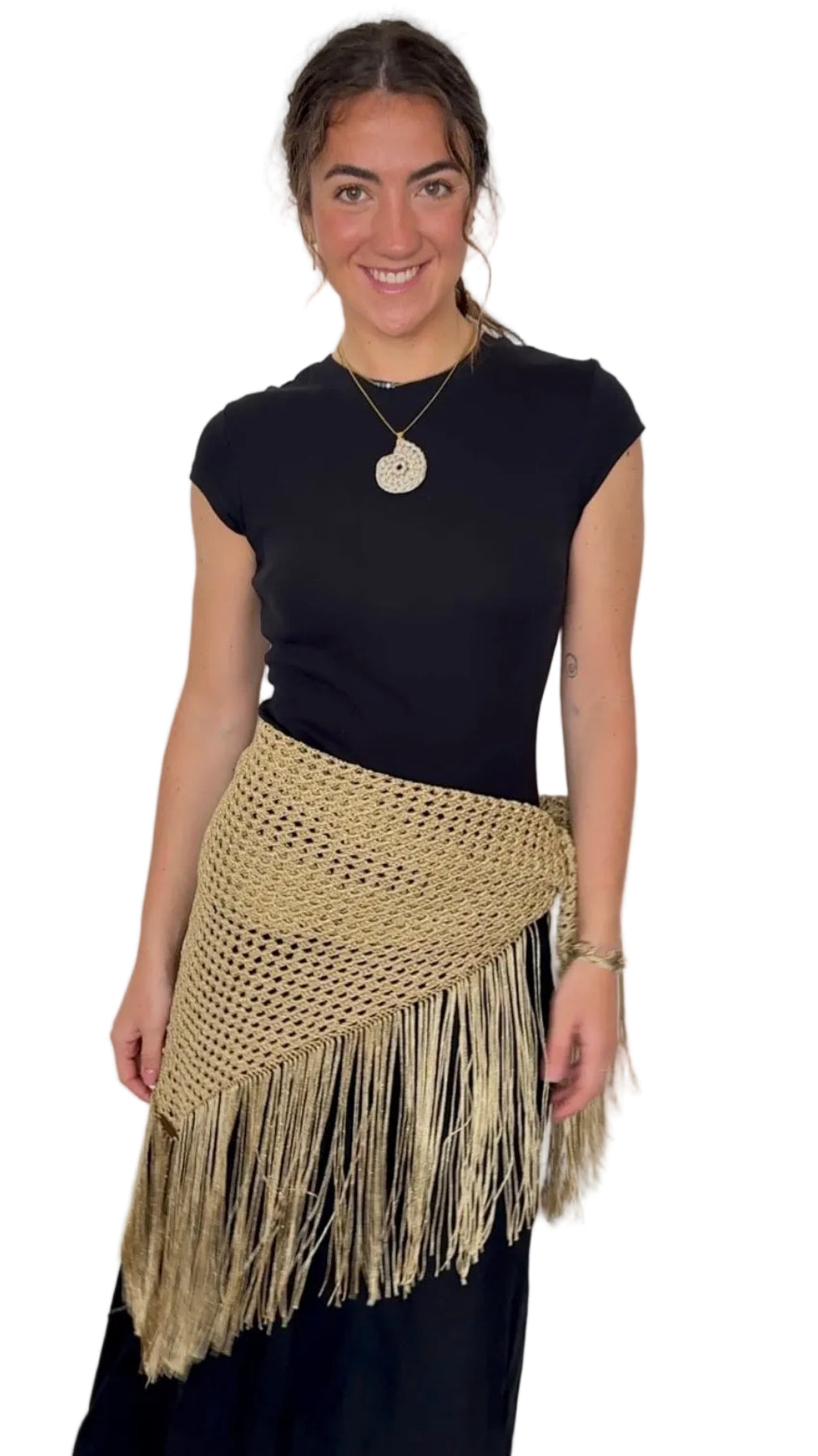Está tejido en un hilo de brillo sutil, ligero al tacto y muy agradable de llevar, pensado para acompañarte sin recargar el conjunto.