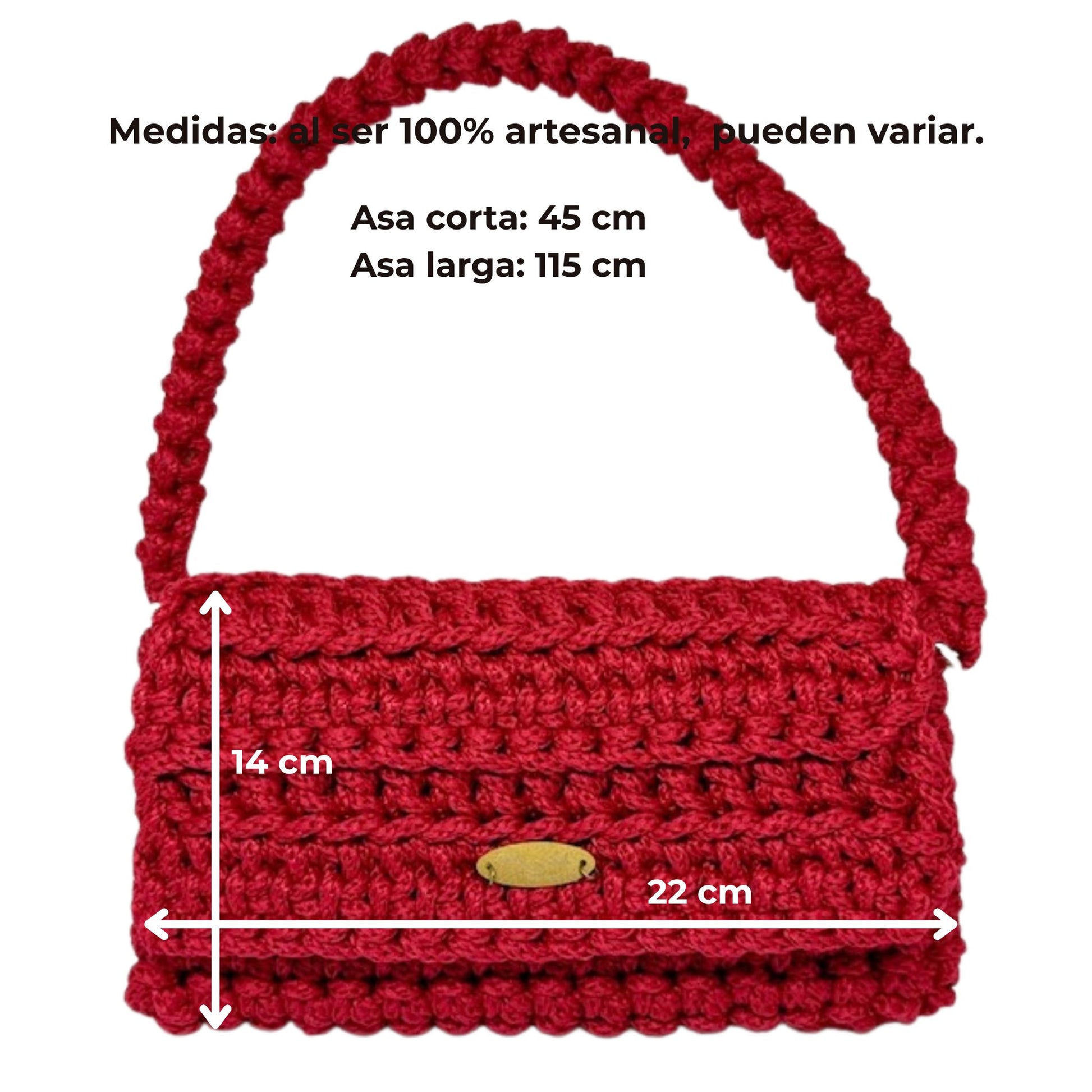 - Asa corta de 45 cm, tejida a croché con el mismo material, ideal para llevarlo al hombro o en la mano.